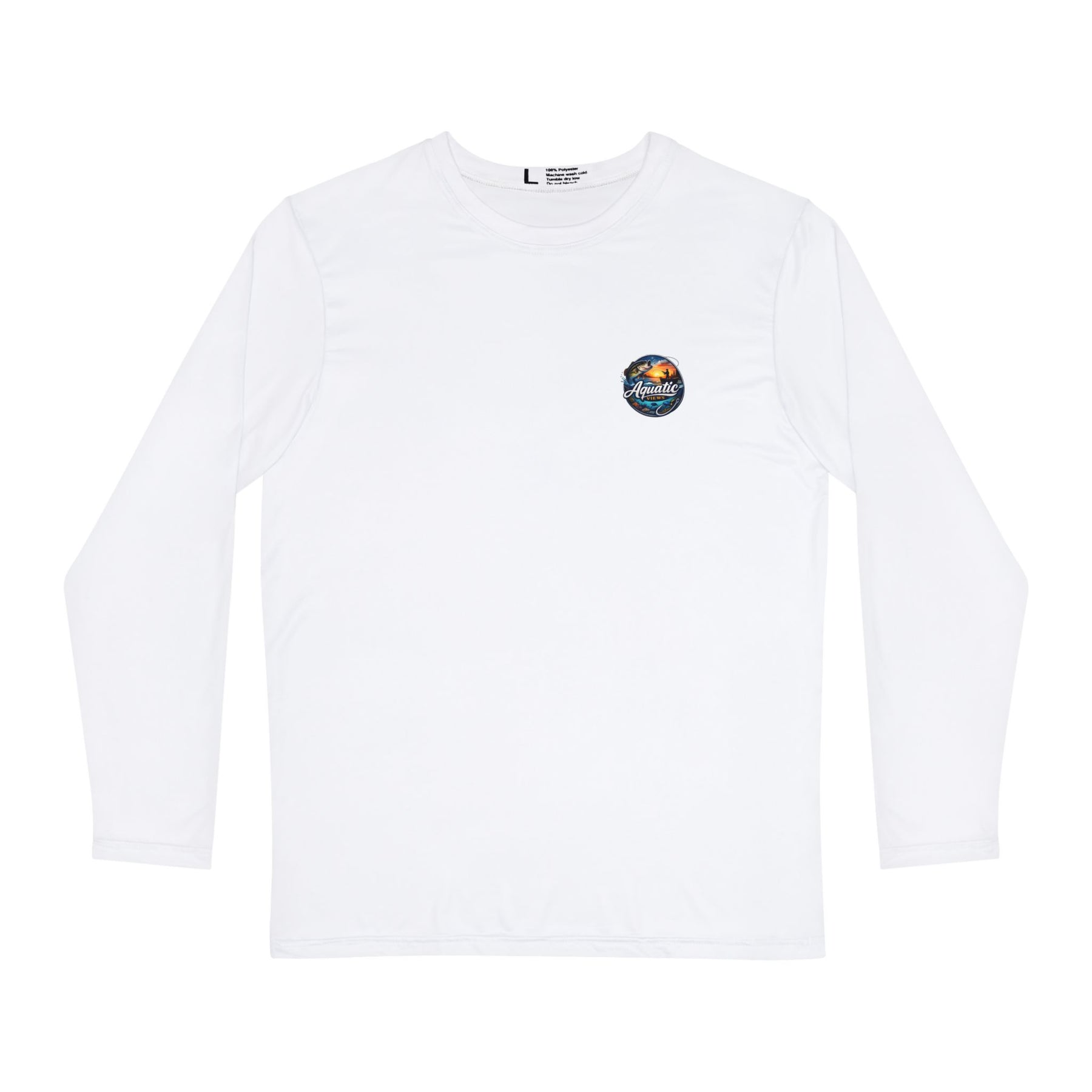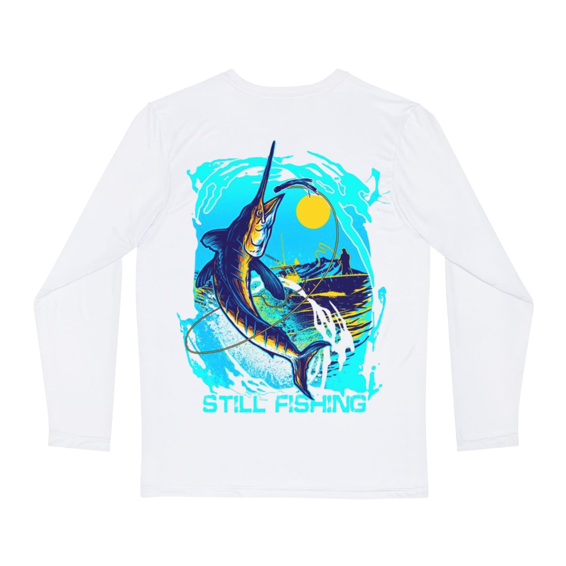 Made with 100% brushed polyester, these long-sleeve tees deliver all the style and comfort one can handle. Impeccably soft, this shirt has a beautiful desing of a marlin jumping to capture the beauties of the ocean. Size and care information printed inside the collar.